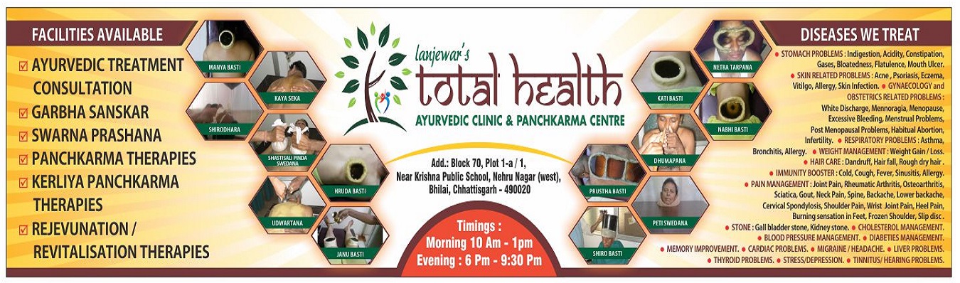 Lanjewar's Total Health - Ayurveda Clinic & Panchakarma Centre is Bhilai based Ayurvedic treatment clinic established in 2010 by Dr. Mini Lanjewar and Dr. Goldy Lanjewar; keeping in mind the guiding principle of Upanishads – "Sarve Santu Niramayaha" or "Let all be free of disease".